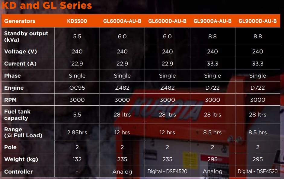 The Kubota GL6000 generator is a two-pole, silent-type, direct-coupled, single-phase diesel generator with a capacity of 6kVA at 3000RPM. Suppling 22.9 amps at 240 volts. The Kubota GL6000 diesel generators feature a remote 2-wire auto start for solar back-ups (digital model only). Powered by our world-renowned Kubota Z482 engine, it’s ease of use and accessibility also makes it ideal for hire and rental company purposes. Running a range time of 12 hours at full load, the GL6000 is the perfect solution to your off-grid back-up power.